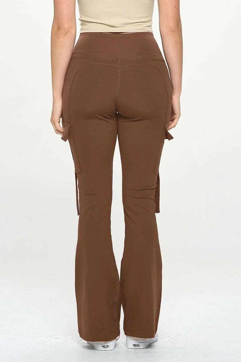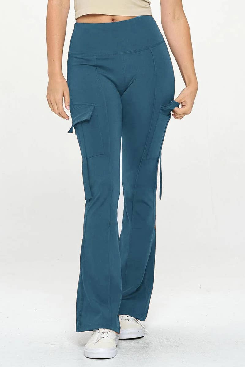 Fashion wide leg flare yoga sculpting pants. High waist elastic wait band. Fitted style. Wide leg flare style. Side with cargo pockets and string ling. Back have hip line trim. 92% poly 8% spandex. Import. 92% poly 8% spandex. Import. Inside pack comes S/M/L(2:2:2) 6pcs/pack.