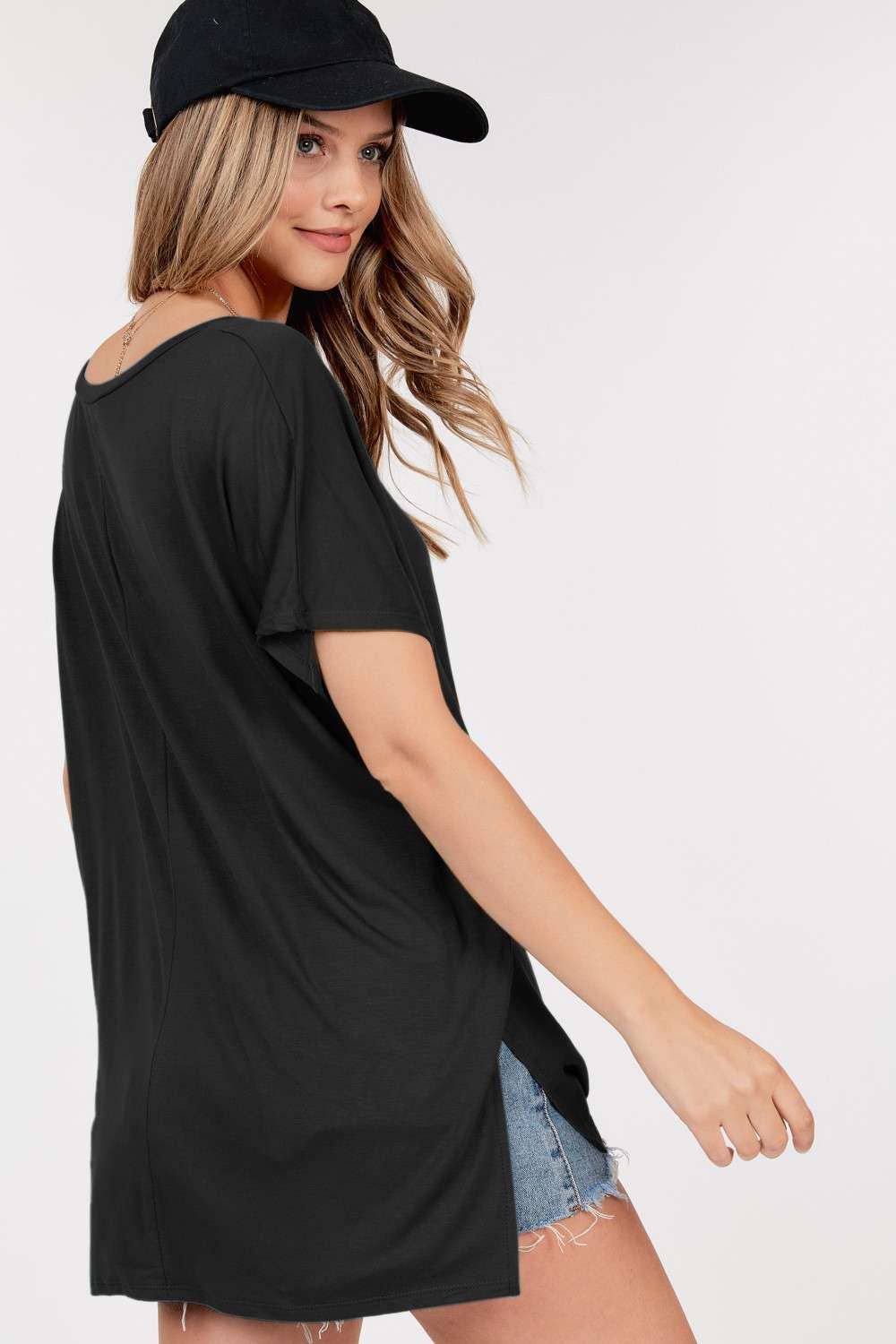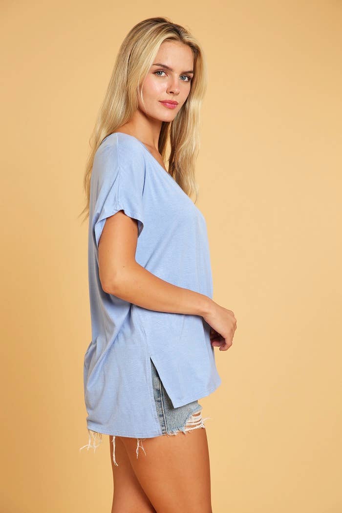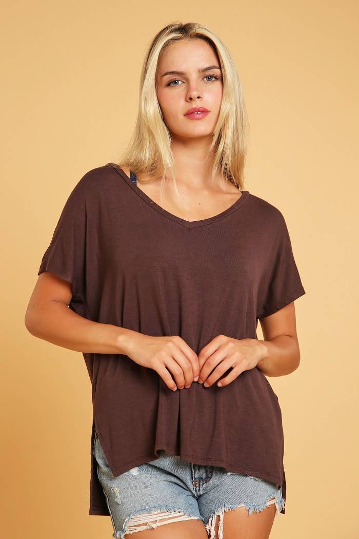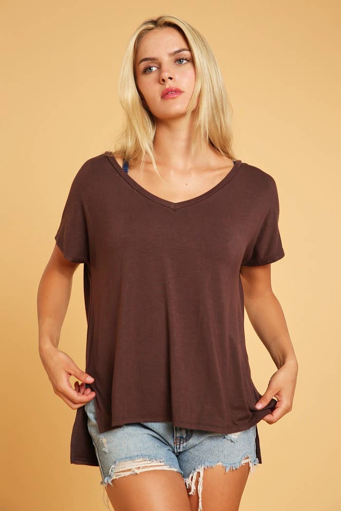 Basic Short Sleeve V Neck Boxy Fit Top With Side Slits And High Low Hem