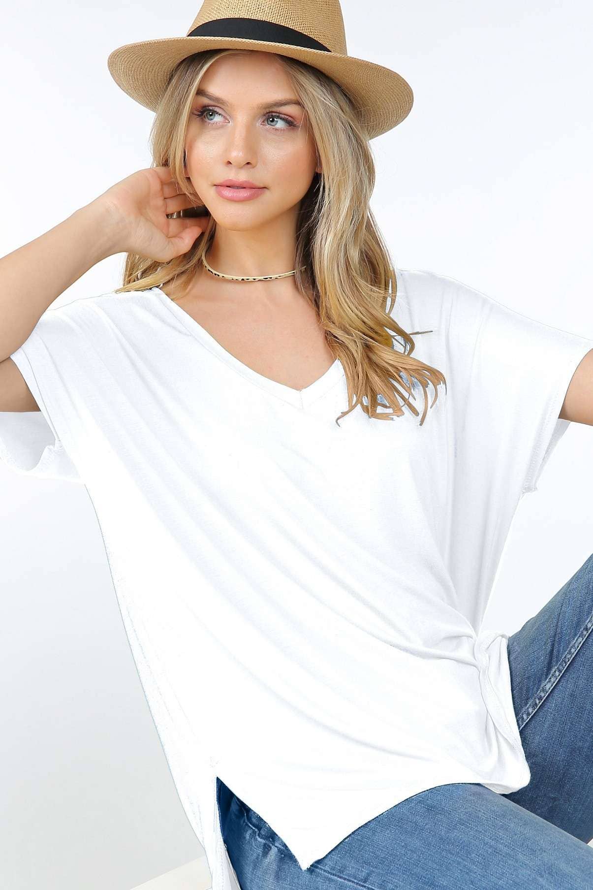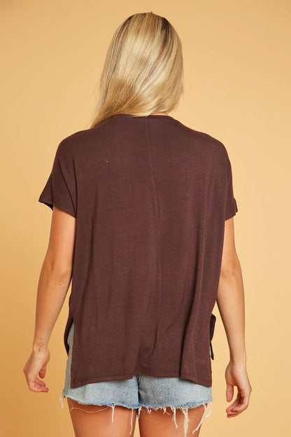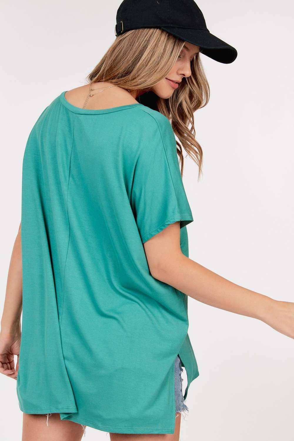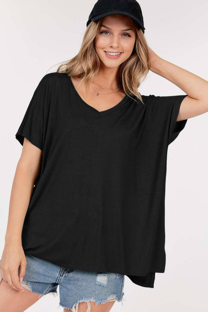 Basic Short Sleeve V Neck Boxy Fit Top With Side Slits And High Low Hem