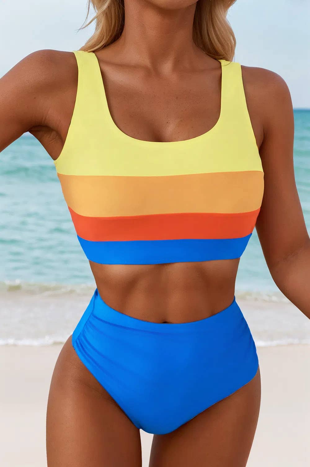 Colorblock Square Neck Top Pleated High Waisted Bikini*S-2XL