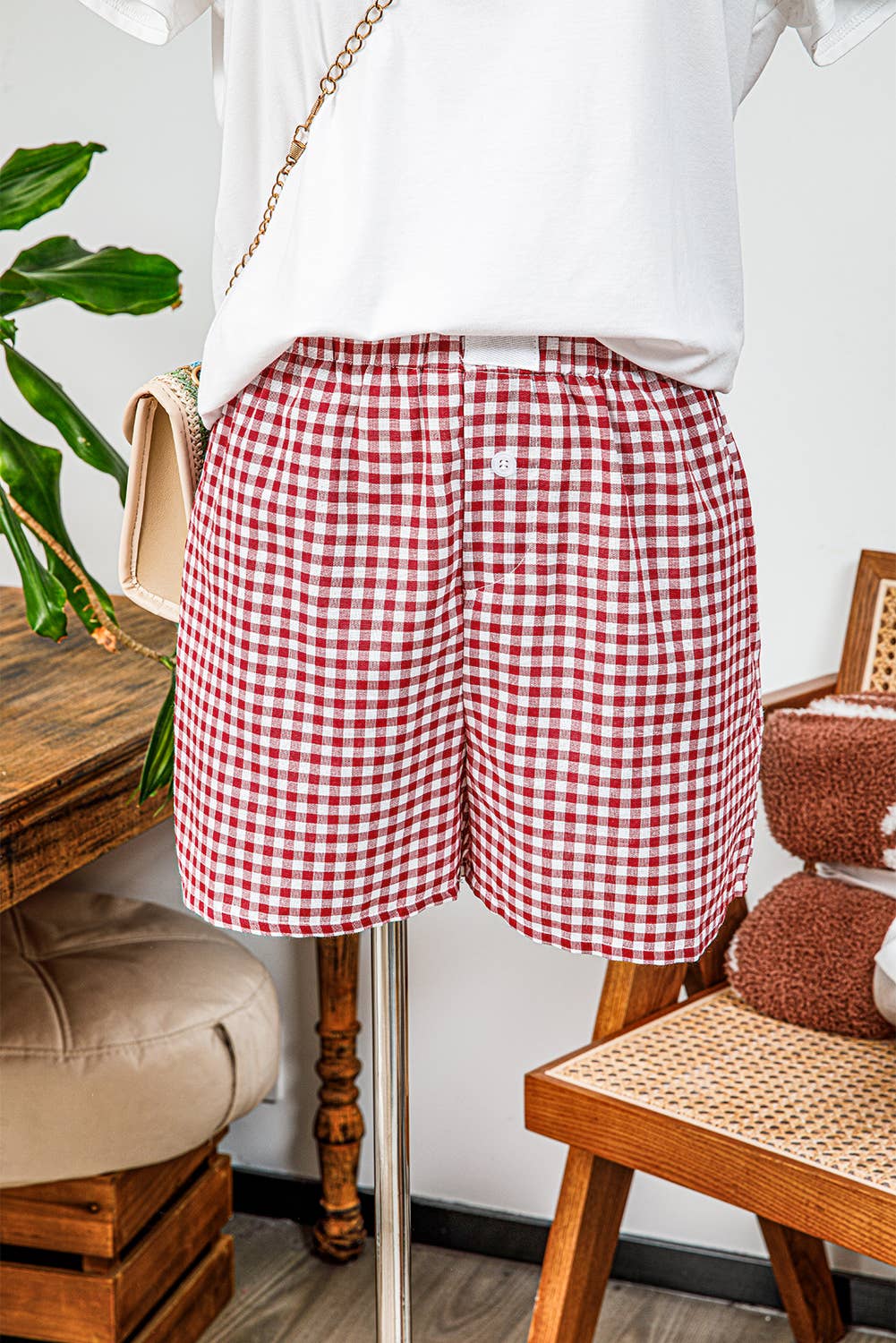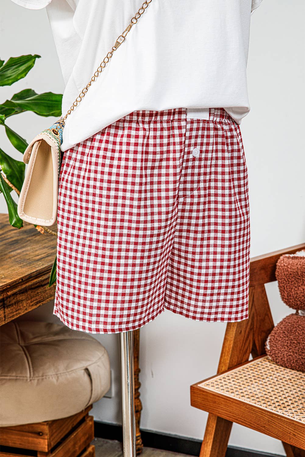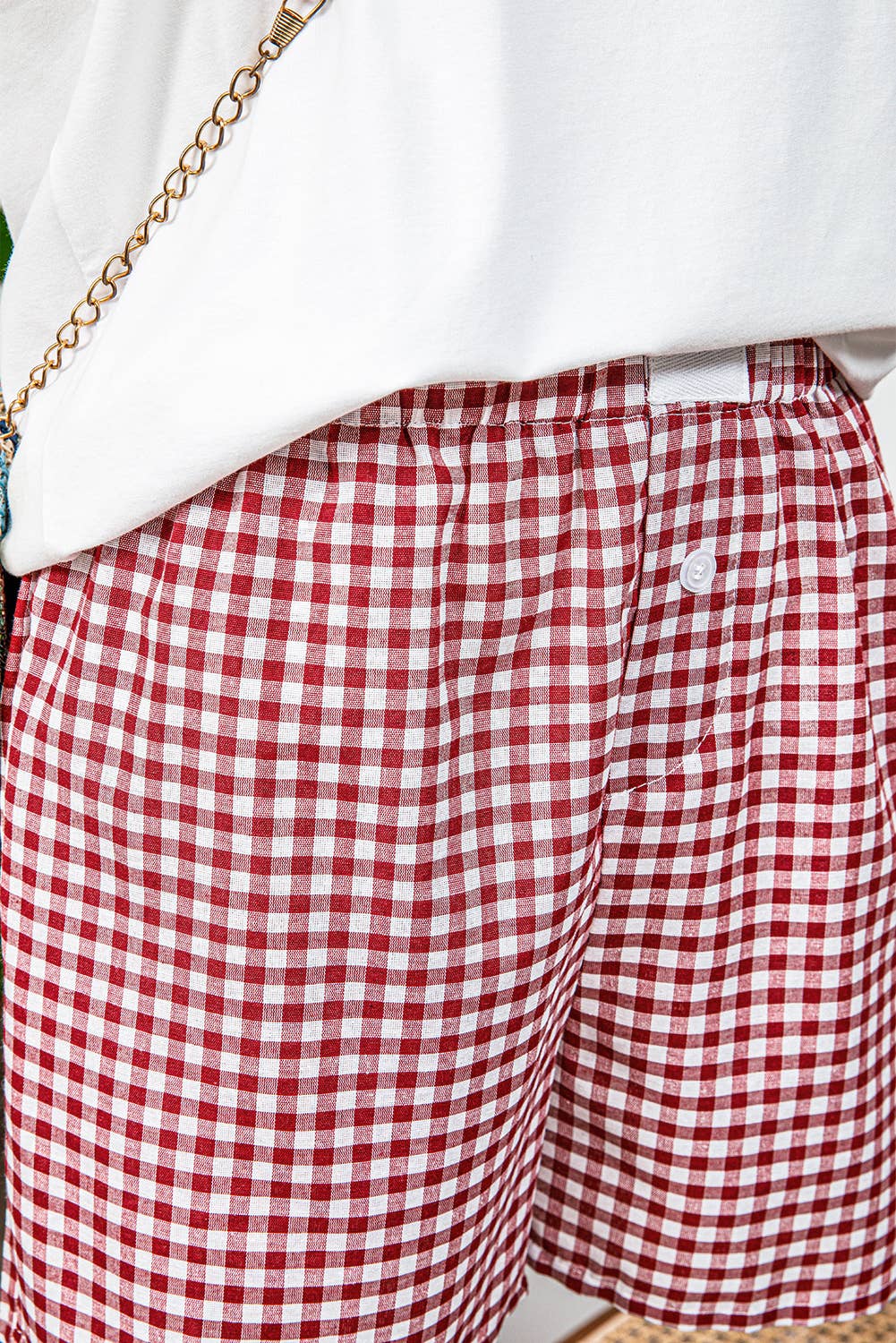 Crafted with a gingham fabric in a red colourway. These shorts offer extreme comfort with an elasticated waistband and single button fly. The elasticated high waist is comfy and easy to pull on. These women’s shorts pair well with t shirts or tank tops.