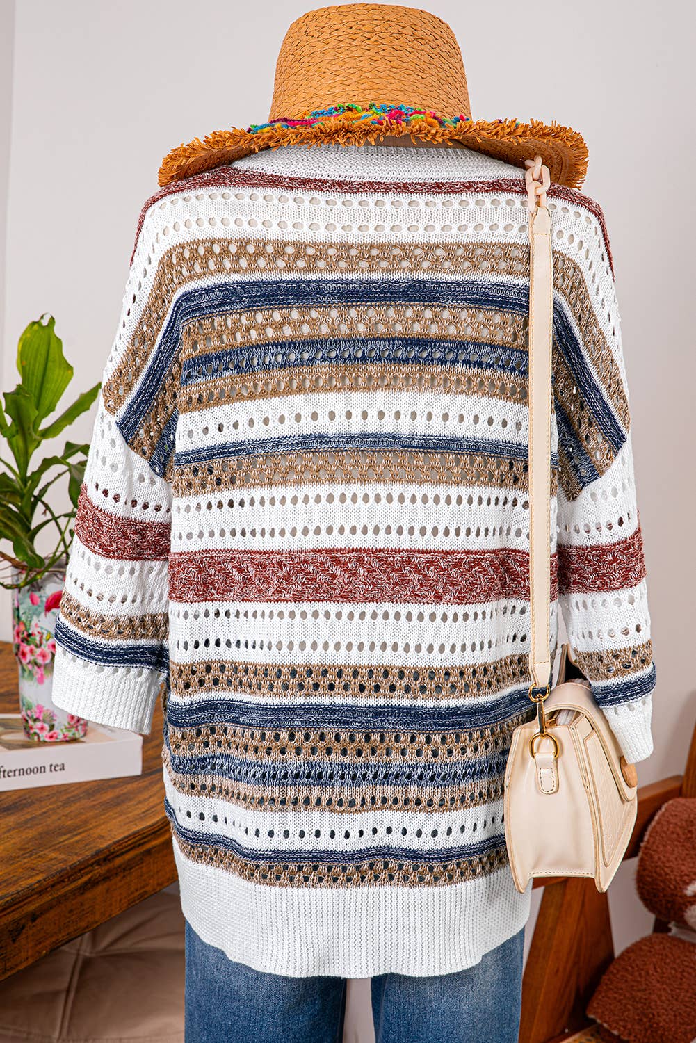 This V-neck sweater showcases a charming blend of cream and blue hues, highlighted by its textured stripe pattern. The combination of solid and open-knit sections adds a unique touch, making it both stylish and breathable. Perfect for elevating your everyday wardrobe with a hint of elegance.