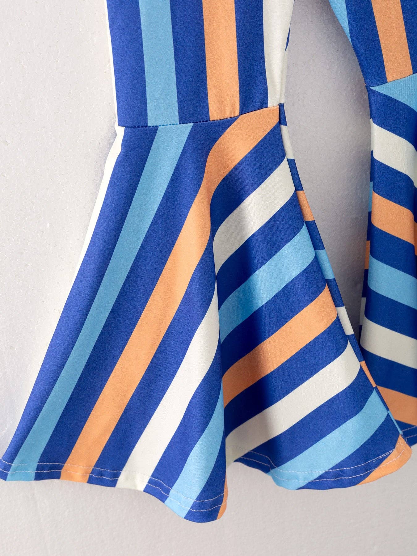 This eye-catching matching set features a bright orange short-sleeved top paired with stylish blue and white striped bell-bottom pants. The playful color contrast and retro-inspired design make it perfect for casual outings.