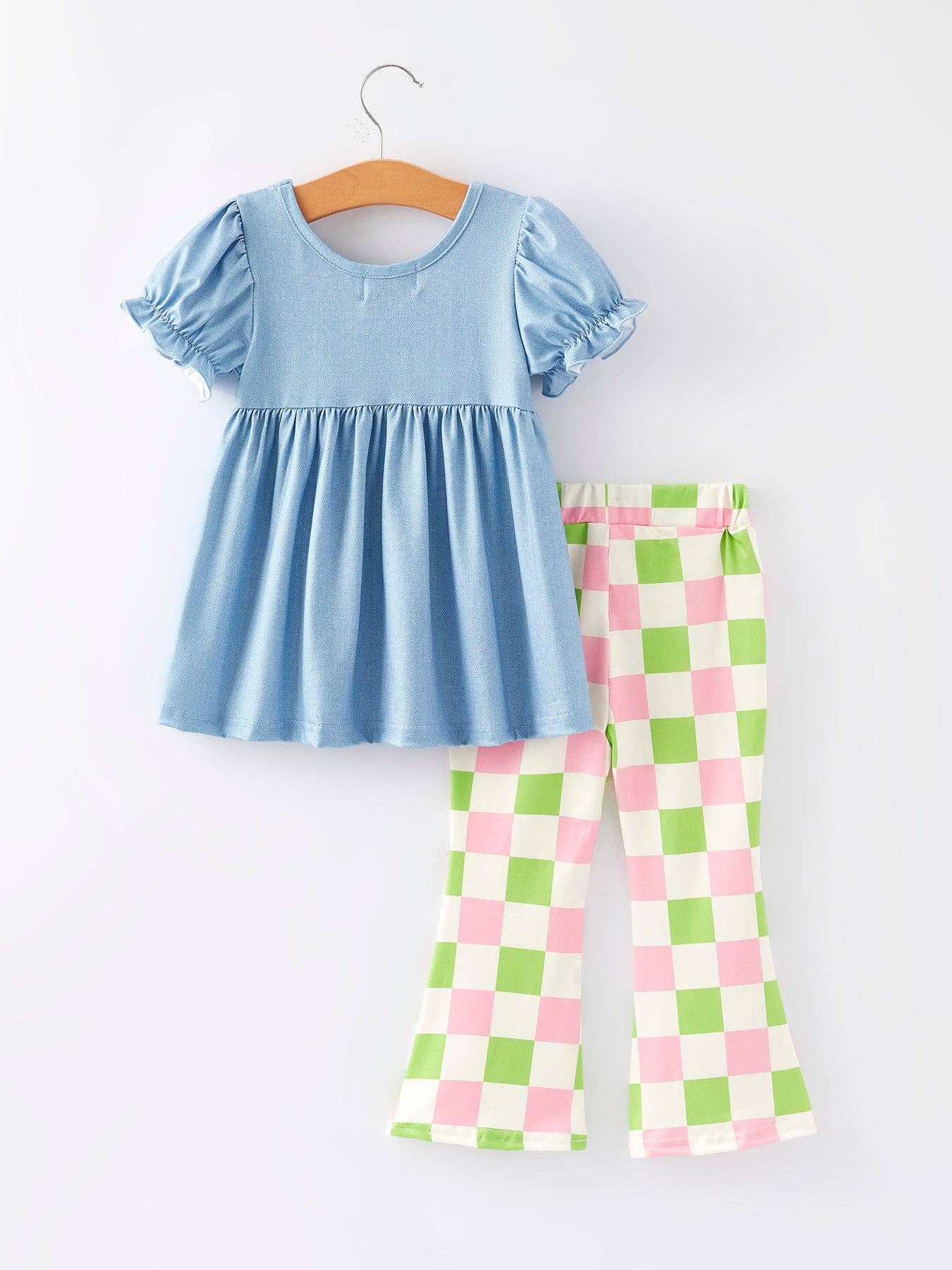 Girls Cartoon Print Checkerboard Pants Outfit Set