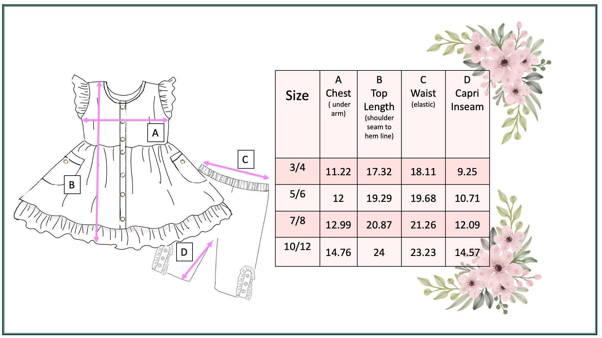 This playful set features a magenta modern flower print tunic top with flutter sleeves and convenient pockets, accented with ruffles and buttons. The gray and white checkered capri pants add a touch of fun with button ruffle details on the side. Perfect for a stylish spring or summer look!