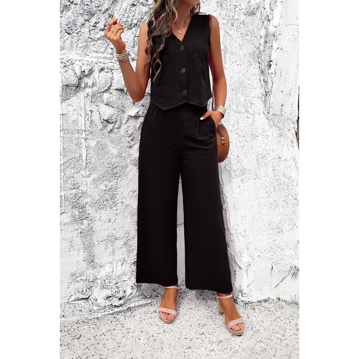 Sleeveless Button Deep V Neck Pockets Solid Sets